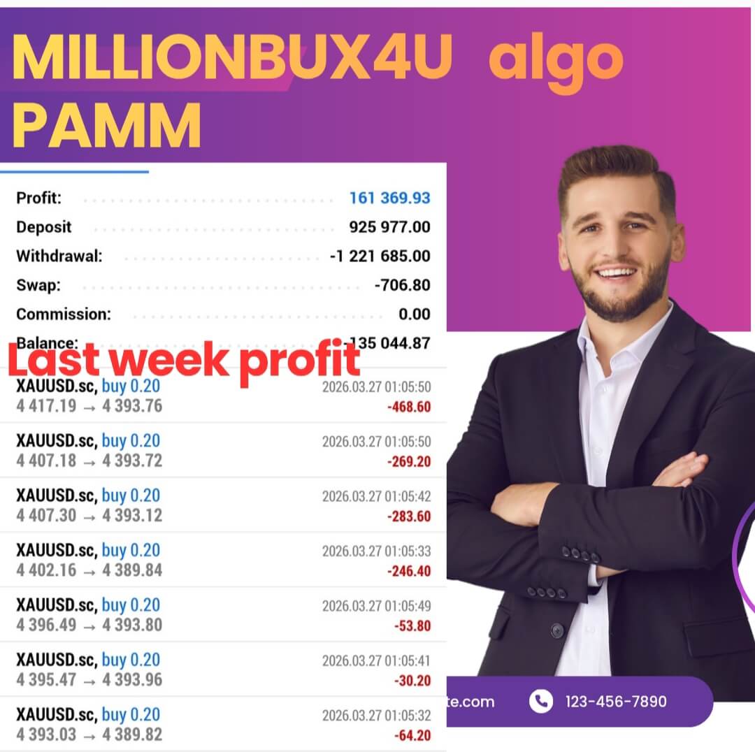 Millionbux4u is a PAMM Algo Trading - profit-sharing based business platform, designed to create a transparent and disciplined ecosystem for participants who believe in long-term, sustainable growth. We operate on a pure profit-sharing model, where income distribution depends on actual business performance, not fixed promises or guaranteed returns.